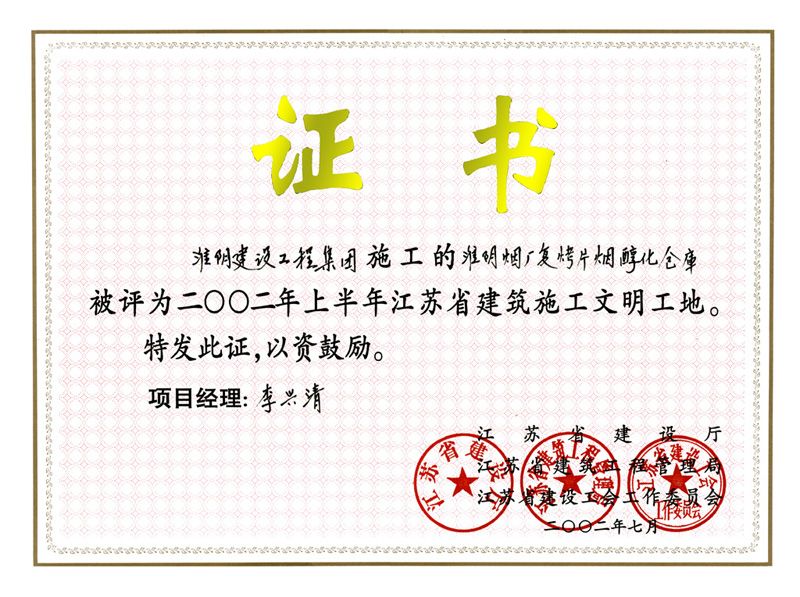 2002年度省建筑施工文明工地淮阴烟厂复烤片烟醇化仓库-李兴清