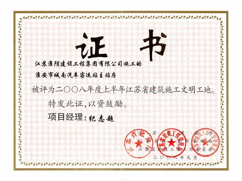 2008年省文明工地-淮安市城南汽车客运站主站房-纪志超