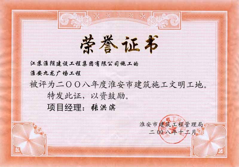 2008年市文明工地淮安九龙广场-张洪滨