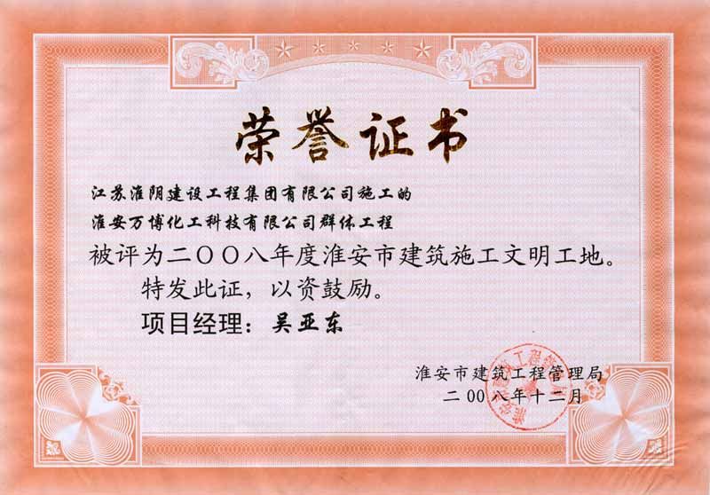 2008年市文明工地淮安万博化工科技有限公司群体工程-吴亚东