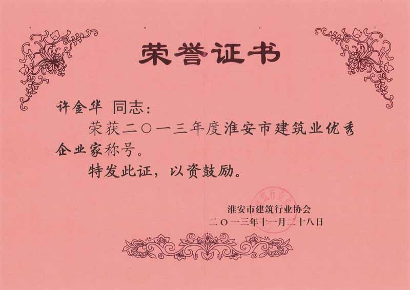 2013年度淮安市建筑业优秀企业家-许金华