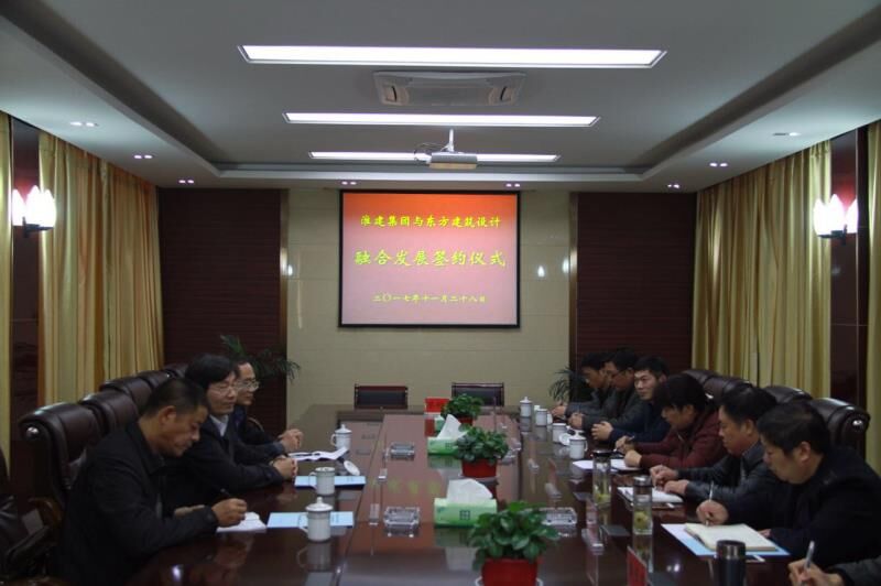 2017年11月28日下午,淮建集团与淮安市东方建筑设计有限公司举行了融合发展签约仪式,集团董事长胡从亮、东方建筑设计董事长吴家荣等出席签约仪式。根据双方协议,东方建筑设计向集团出让75%的股份,成为集团的成员企业,同时承揽集团总承包工程的勘察、设计等业务。
